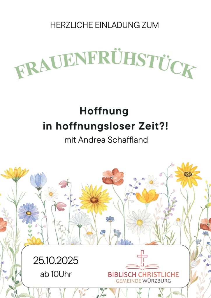 Frauen-frühstückAm 25.10.2025 um 10:00 Uhr möchten wir als Gemeinde Frauen einladen, gemeinsam ein Frauenfrühstück mit Andrea Schaffland zu genießen. Das Thema ist Hoffnung in hoffnungslosen Zeiten. Wir freuen uns auf…